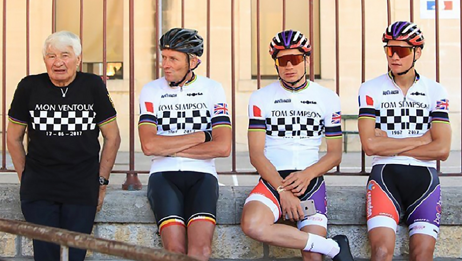 Een supporter toont het wielertruitje van poulidor.